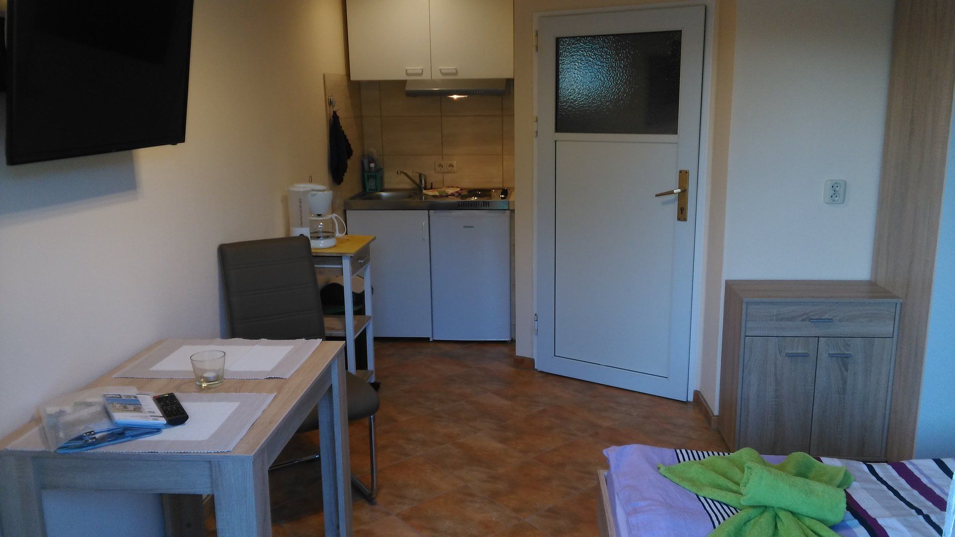 Miniküche im Wohnraum integriert ( Kühlschrank, 2-Plattenherd,